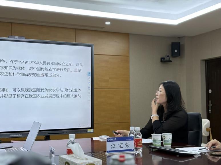 博士生赵静基于史料耙梳,对中国近代农学汉译进行了历史分期,并探讨其对农业认知、农业学科体系建构和农学知识创新的影响。汪宝荣在点评中指出,此研究作为断代农书翻译史,应明确选择中国近代这一历史阶段进行研究的原因,并建议可与农学专家交流学习、就日本农书转译进行深度挖掘、以及使用社会学作为翻译史研究方法的可能性。杨宝和袁梅分别从历史阶段划分的严谨性、研究标题和小标题表述、文章内容划分和组织等方面提出了建议。贺爱军肯定了选题的跨学科研究价值,并为研究的完善提出了若干具体建议——扩充文献综述部分,以提升研究的科学性;基于农学自身的发展体系进行农书汉译历史阶段的划分;囊括每个阶段重要的翻译机构和翻译实践等。