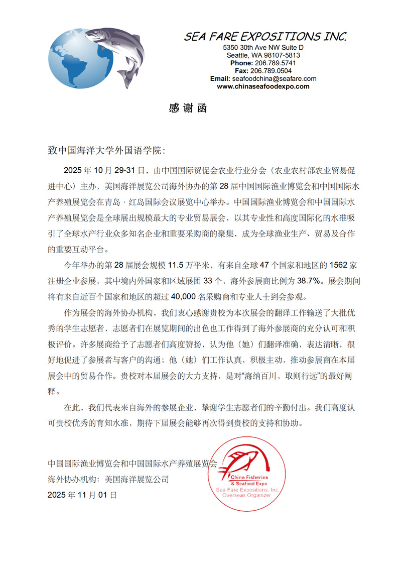 大会主办方向外国语学院发来感谢信,对志愿者们予以高度评价,指出:“同学们在翻译准确性和沟通有效性方面表现突出,有效促进了参展商与客户间的交流,为展会成效提供了重要支持。我们深切感谢同学们的辛勤付出,他们所展现的责任感与纪律性,正是中国海洋大学外国语学院育人成果的集中体现。诚挚期待在下届展会中能继续与贵校携手合作。”