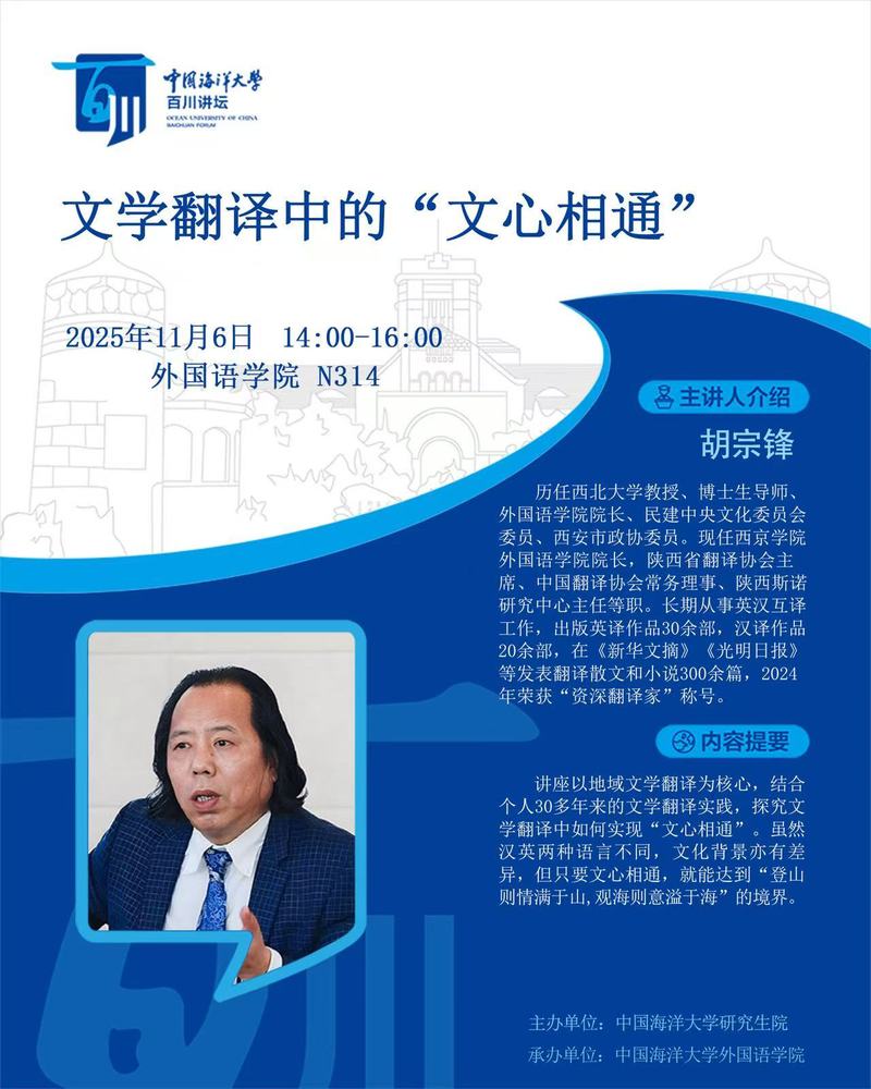 讲座预告|胡宗锋教授:文学翻译中的“文心相通”
