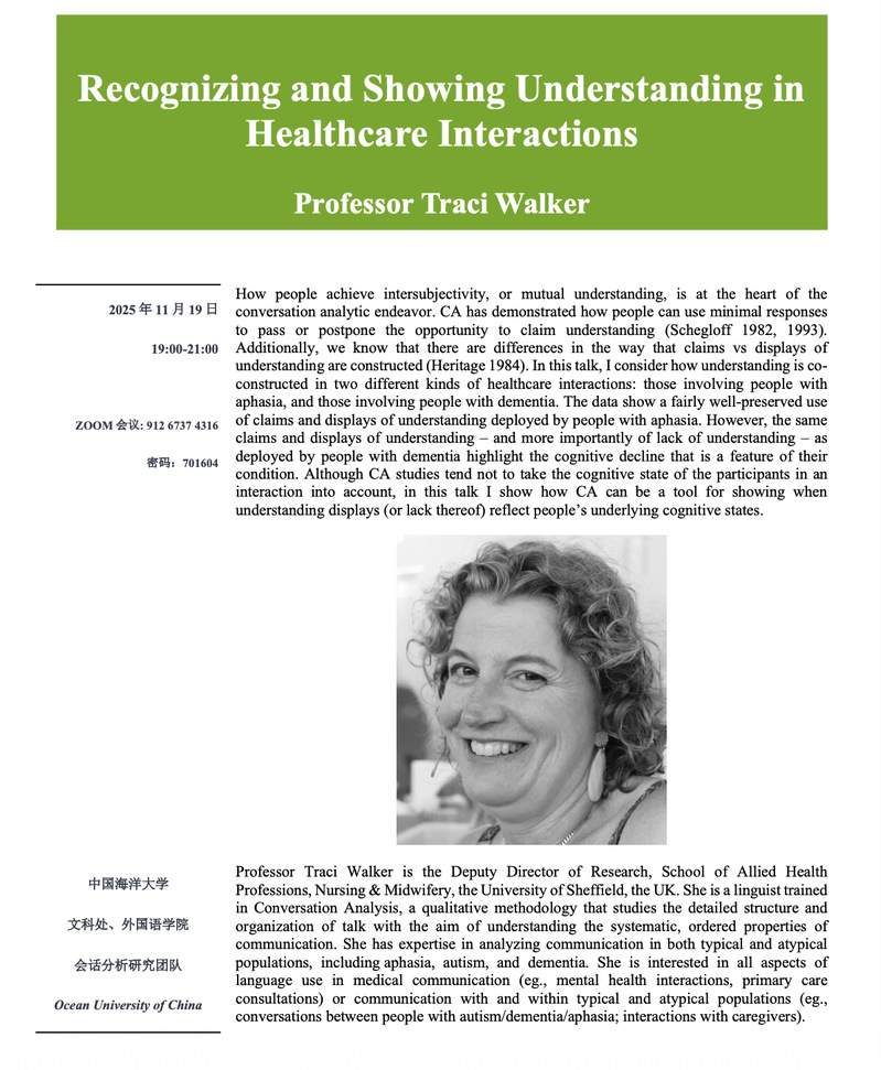 讲座预告|Prof. Traci Walker: Recognizing and Showing Understanding in Healthcare Interactions
