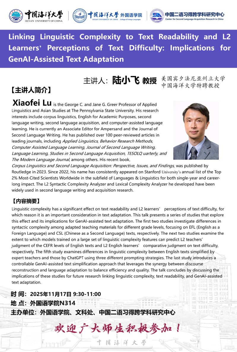 讲座预告| 陆小飞教授:Linking Linguistic Complexity to Text Readability and L2 Learners' Perceptions of Text Difficulty: Implications for GenAI-Assisted Text Adaptation
