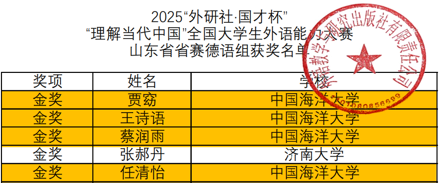 【本站讯】第三届“外研社·国才杯”“理解当代中国”全国大学生外语能力大赛山东赛区多语种组获奖名单近日揭晓。中国海洋大学外国语学院孙丽丽老师指导的四名德语专业本科生2022级贾窈、2023级王诗语、2023蔡润雨、2023任清怡,凭借扎实的语言功底、出色的综合运用能力和对当代中国发展成就的深刻理解,全部获得金奖。其中,贾窈、王诗语、蔡润雨三位同学成功晋级全国总决赛。本届山东省赛德语组共设金奖5项、国赛晋级名额4个。学校外国语学院德语系学子一举夺得其中4项金奖,并收获3个国赛晋级名额,充分彰显了学校德语专业显著的育人成效。