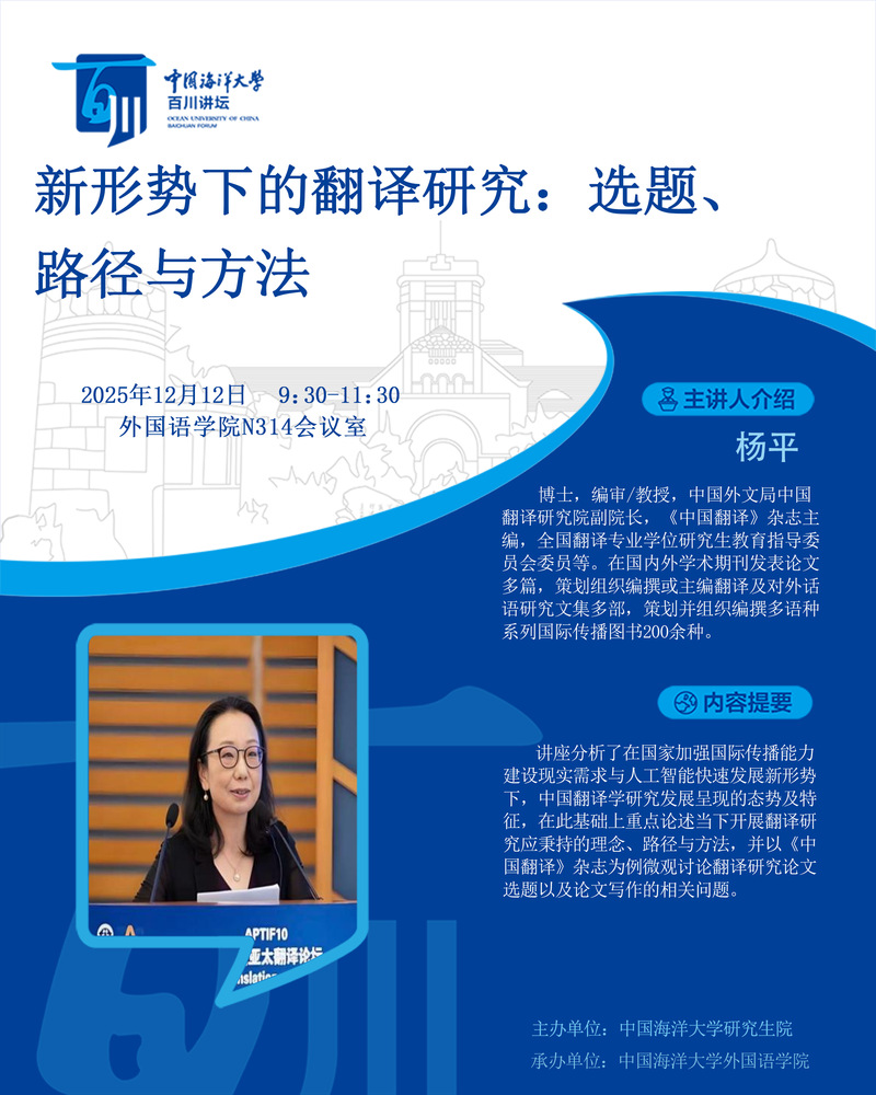 讲座预告| 杨平教授:新形势下的翻译研究:选题、路径与方法