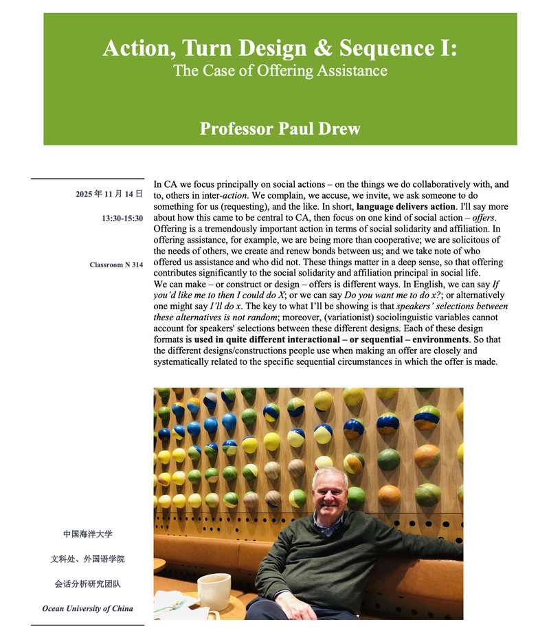 讲座预告| Prof. Paul Drew: Action, Turn Design & Sequence I:The Case of Offering Assistance