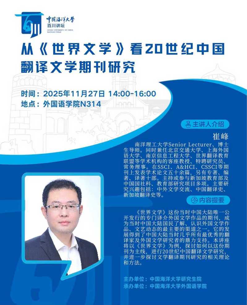 讲座预告|崔峰教授:从《世界文学》看20世纪中国翻译文学期刊研究