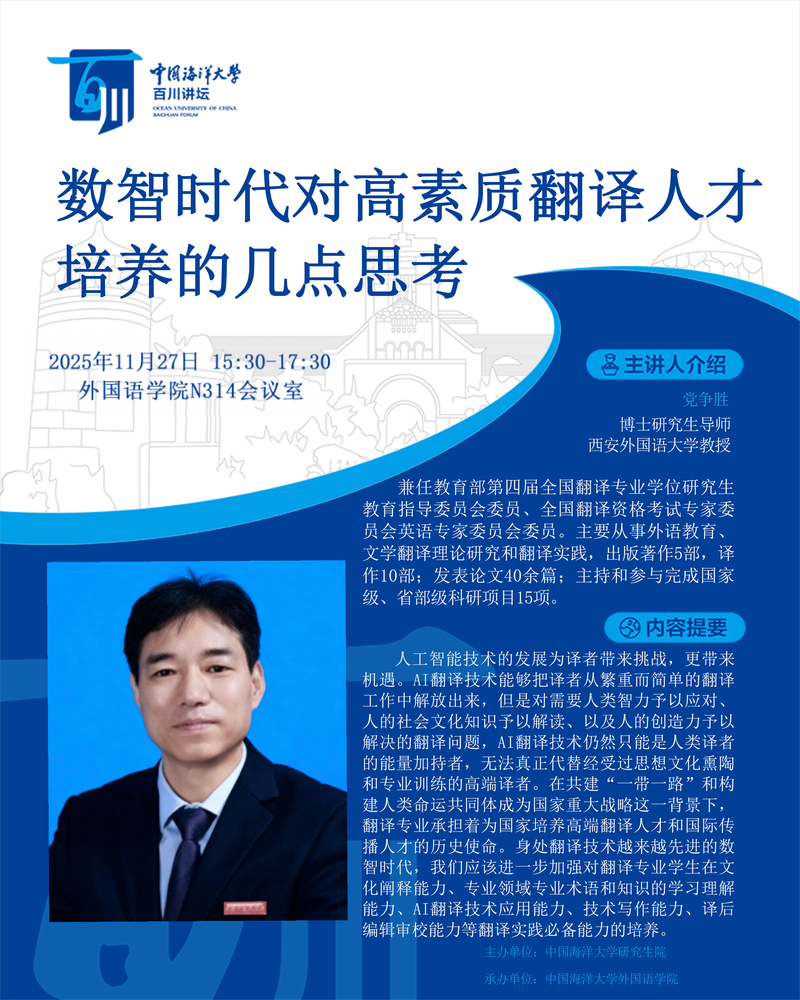 讲座预告|党争胜教授:数智时代对高素质翻译人才培养的几点思考