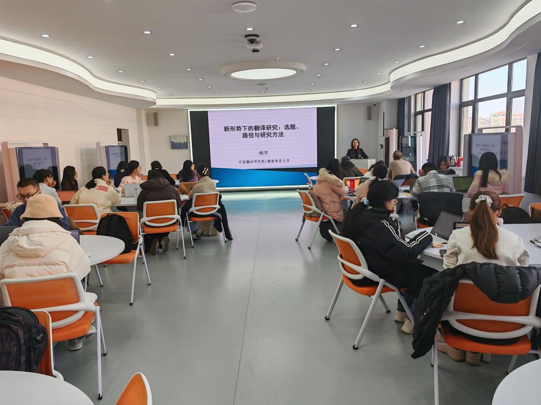 讲座中,杨平立足新时代新形势,提出新文科建设需扎根中国实践,回应时代需求,坚守“继承性与民族性、原创性与时代性、系统性与专业性”原则。针对翻译研究的前沿热点,杨平指出其正处于从“外译中”到“中译外”的转向阶段,重点包括中国时政文本外译、现当代作品对外译介、经典典籍传播、中译外人才培养等。杨平还强调了研究应“贴近时代、贴近现实、贴近社会”,兼顾当代翻译研究、教学研究,正视人工智能对语言服务行业带来的结构性变革。围绕翻译研究实践,杨平提出需妥善处理“三大关系”——首先是厘清翻译学科与其他学科的关系,明确跨学科是方法而非目的,坚守翻译学科的本体属性;第二是把握新旧研究范式的互补关系,避免二元对立的认知倾向;第三是平衡理论与实践、科学与人文、工具与思辨的关系,倡导科学精神与人文精神的融合,推动政策研究与学术研究的有机结合。
