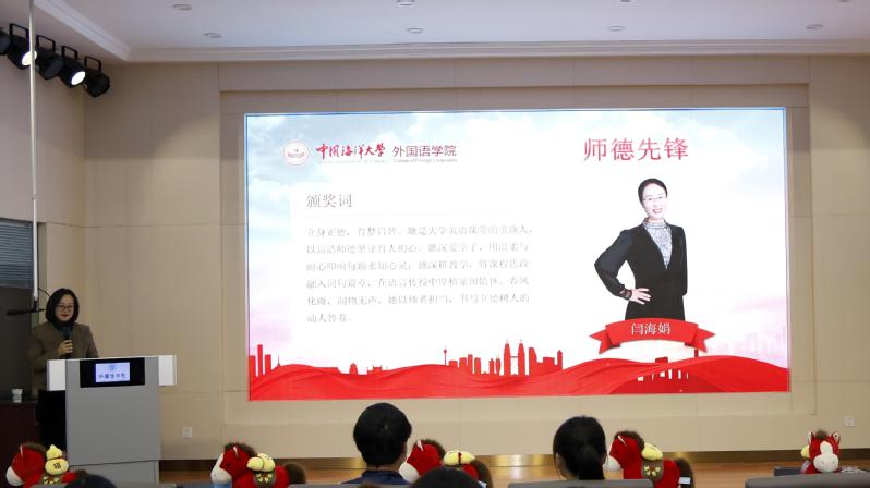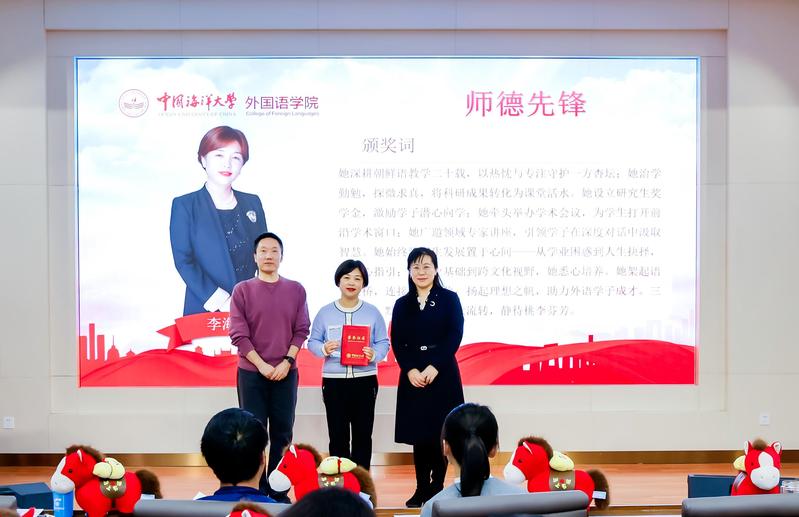 会上,于国栋宣读《外国语学院关于表彰第三届师德先进典型的决定》。经学院党委研究,决定授予任东升、李海英、闫海娟3位教师第三届“师德先锋”荣誉称号,授予郎玥、王爱静、金龙范、孙丽丽、于琰5位教师第三届“师德先进个人”荣誉称号,以表彰他们在教书育人实践中展现的高尚师德与责任担当。