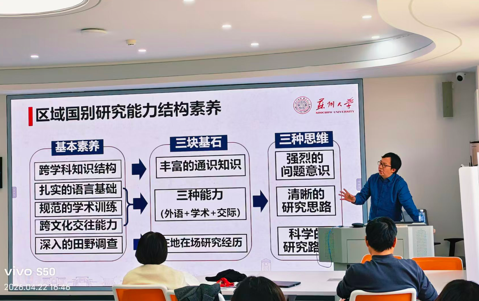 【本站讯】2026年4月22日下午,苏州大学二级教授、国家社科基金重大项目主持人孙继强教授在外国语学院以“新文科背景下外语学科的转型:区域国别研究的实践与突破”为题,讲解了区域国别研究的核心内涵、发展脉络、研究体系与学科建设路径,提出了深刻见解。讲座由日语系张小玲教授主持,生安锋、郭晓丽、金亚奇、刘琦、周奕珺等近30位师生参加。